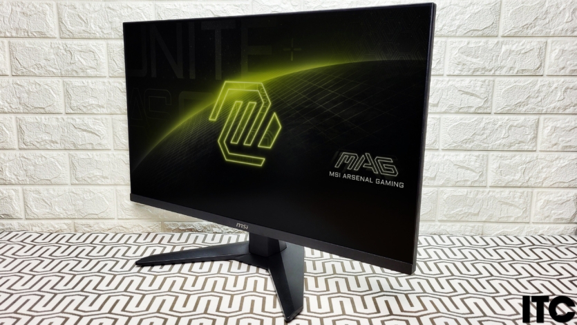 Монитор достаточно легкий. При габаритах самой панели (614 x 363 x 62 мм) он весит около 4.7 кг вместе с подставкой. Небольшая V-образная стойка сделана в геймерском стиле из пластика, с металлическим усилением снизу. Это типичное дизайнерское решение для серии MSI MAG. Блок питания здесь внутренний.